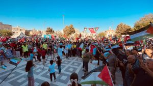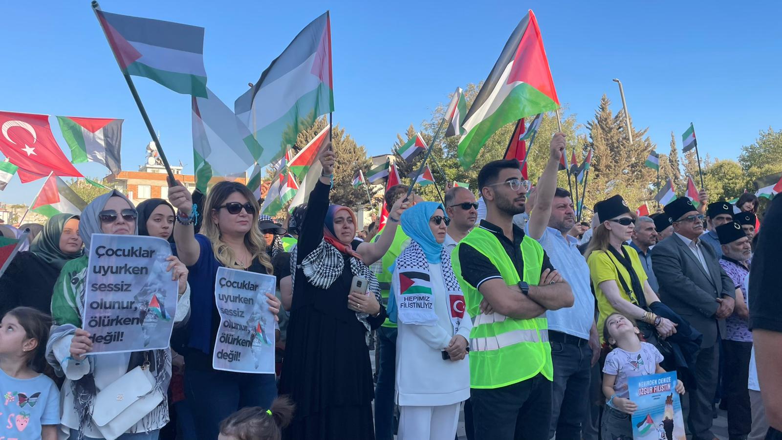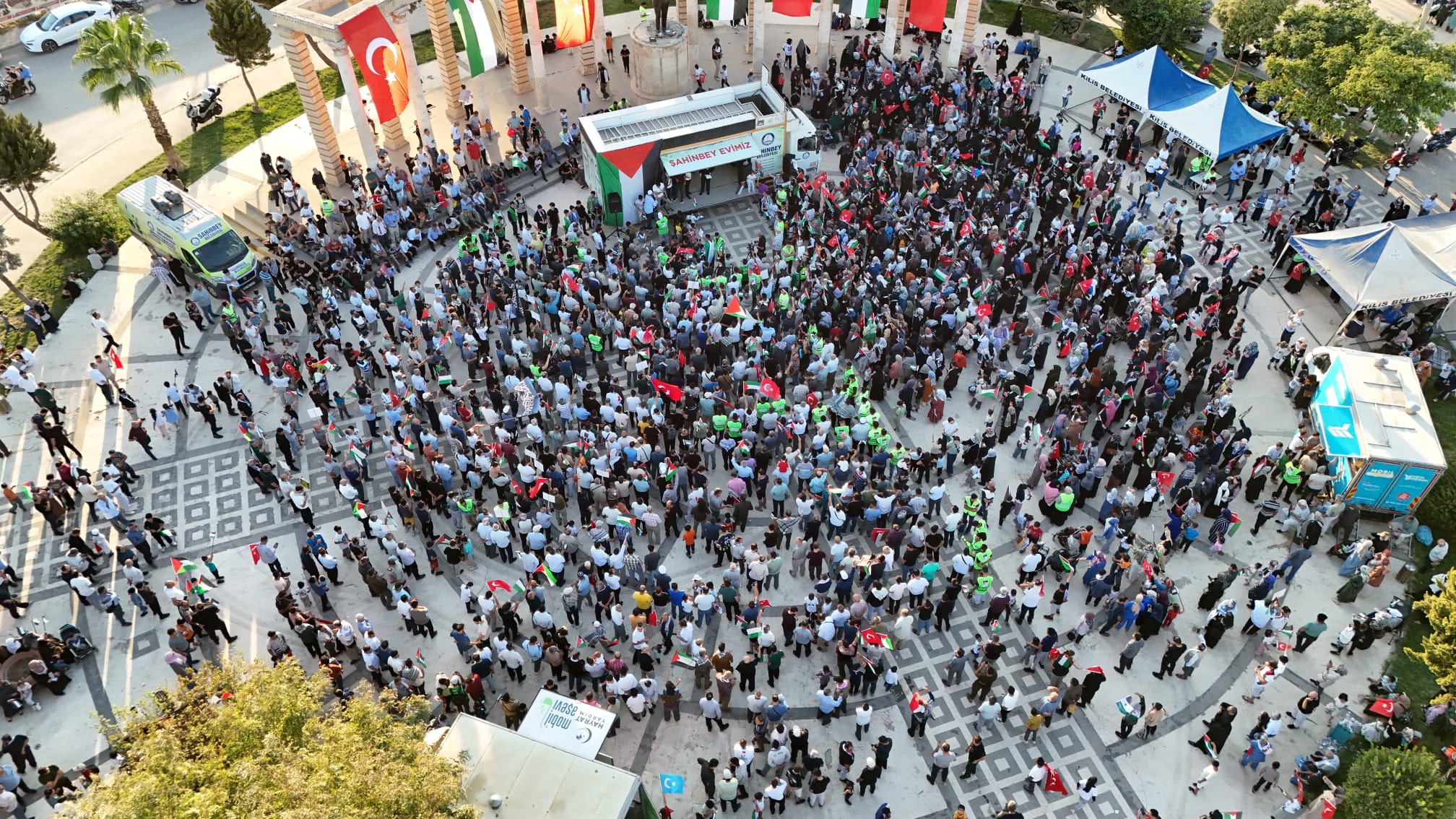 Kilis’te düzenlenen mitingde dualar edildi, Kur’an-ı Kerim okundu ve Sumud Filosu’ndaki yolcularla canlı bağlantı kurularak dayanışma mesajları iletildi. Katılımcılar, İsrail’in saldırılarını kınayarak özgür Filistin için desteklerini yineledi.
